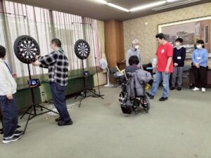 後半は、前回より延期したインクルーシブ・ダーツを楽しみました。 昨年度も開催して希望が多かった人気企画です。 当たっても危険の無いソフトダーツを使用して、自分の投げやすい位置から、時には補助具を使用して挑戦しました。 ダーツが刺さらない場面もありましたが、的に当たれば得点になります。 4チーム対抗戦で、Kさん、Hさん、YさんのCチームが優勝しました。
